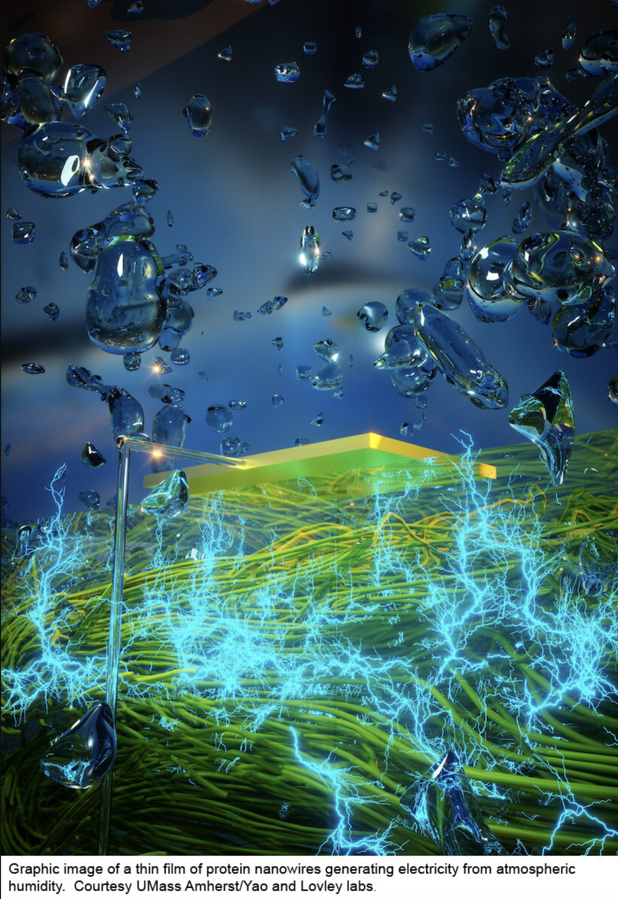 Here we show that thin-film devices made from nanometre-scale protein wires harvested from the microbe Geobacter sulfurreducens can generate continuous electric power in the ambient environment…We find the driving force behind this energy generation to be a self-maintained moisture gradient that forms within the film when the film is exposed to the humidity that is naturally present in air.